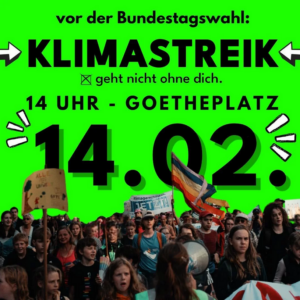 10. August 2025: Wettbewerb – Dein Spot für GUTES KLIMA News lesen 21. Juli 2025: Aktion GUTES KLIMA – wie es 2025 weitergeht / Wie wird Deutschland ein Zukunftsland? News lesen 6. März 2025: Mach mit bei der Planung für 2025 News lesen 12. Februar 2025: Aufruf zum Klimastreik & Wählen gehen! News lesen 14. Dezember 2024: DANKE fürs Mitmachen & Nachlese zur Aktion GUTES KLIMA News lesen 21. November 2024: Abschluss der Aktion GUTES KLIMA / Dein Schritt bei Konsum & Ernährung News lesen